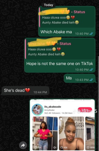 A popular Ibadan-based TikToker known as Aunty Abake has reportedly passed away after collapsing during a livestream on her social media platform.