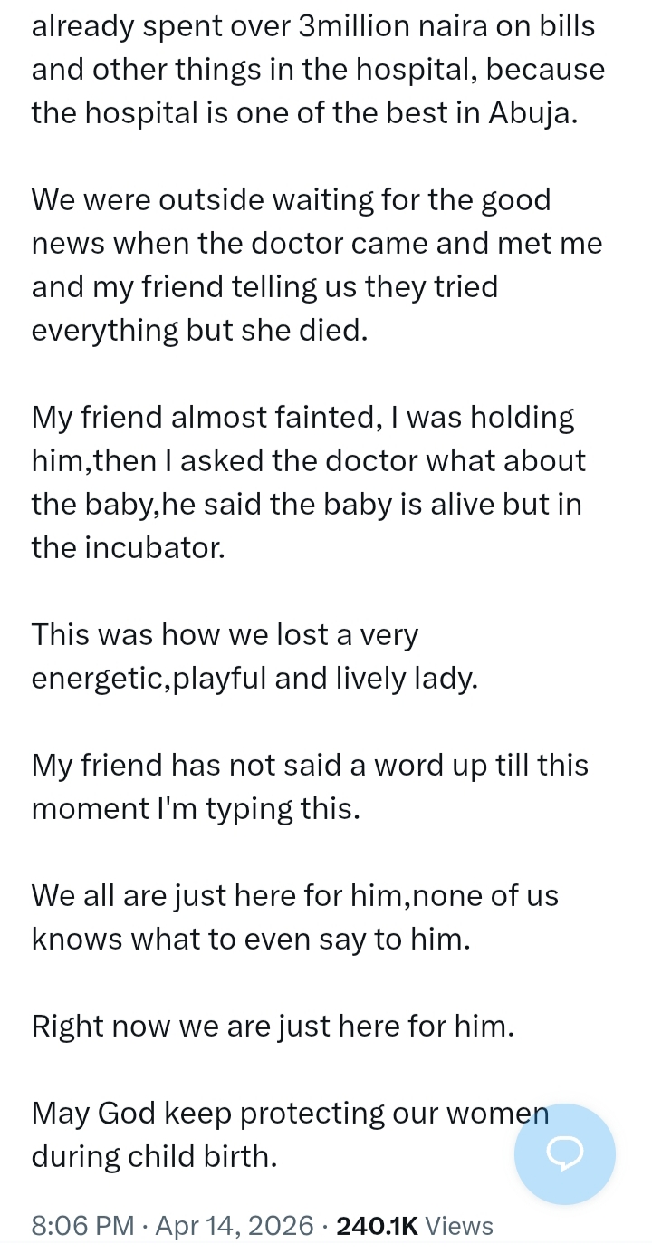 A Nigerian man has reportedly lost his wife during childbirth at a hospital in Abuja, in a heartbreaking incident that has left family and friends in shock.
