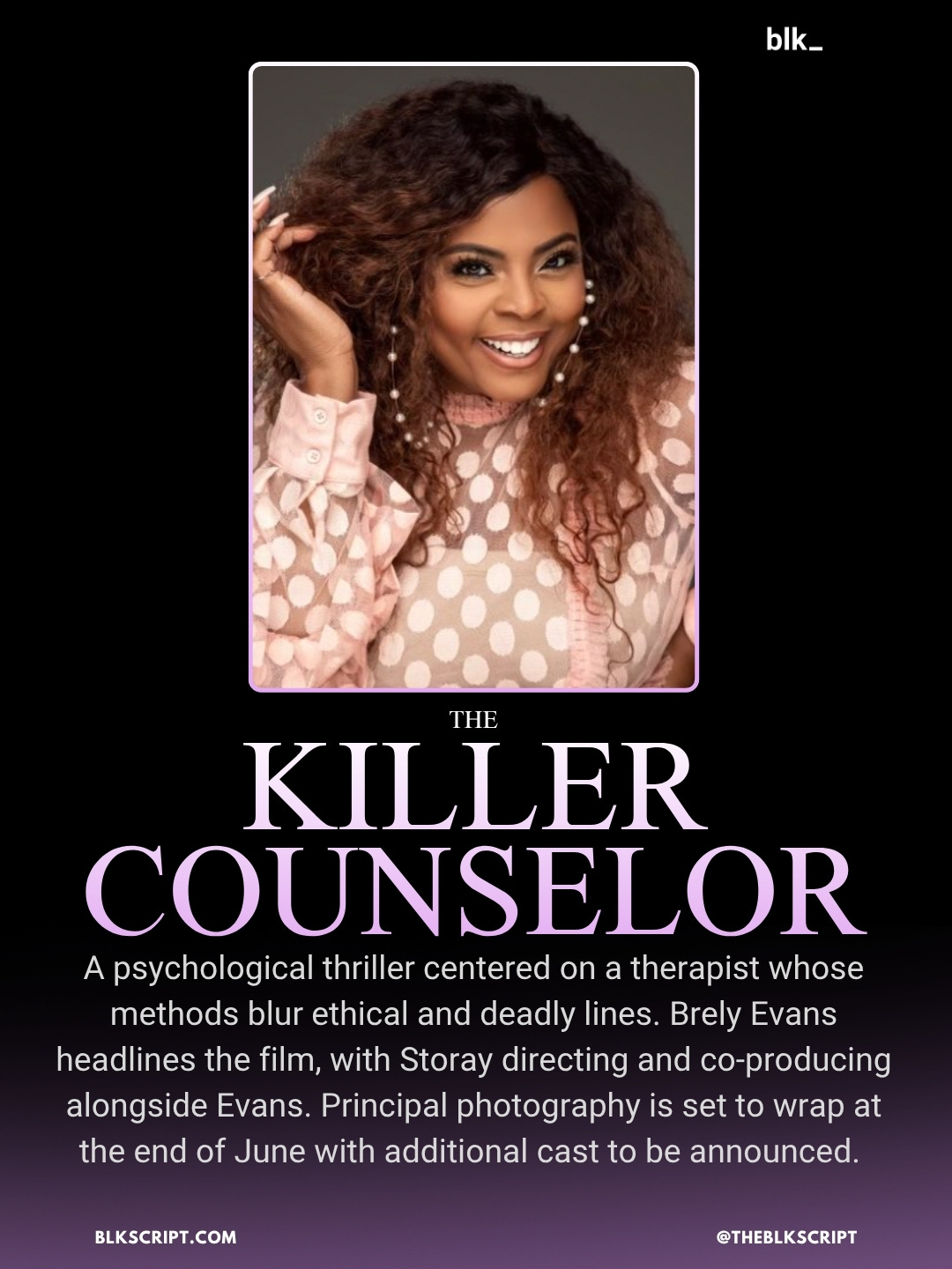 A psychological thriller centered on a therapist whose methods blur ethical and deadly lines. Brely Evans headlines the film, with Storay directing and co-producing alongside Evans. Principal photography is set to wrap at the end of June with additional cast to be announced.